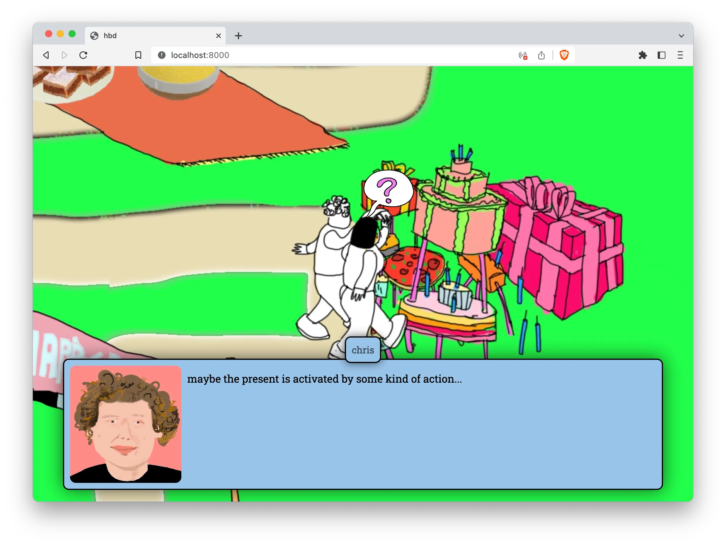 Zum einen hast Du die Möglichkeit, mit neuen Techniken zu experimentieren, für die Du dir sonst vielleicht nie die Zeit nehmen würdest. Du wolltest schon immer etwas mit Dialogsystemen in der Godot Game Engine, komplexen Animationen in CSS, oder Particle Systems in Blender machen? Ein digitales Geschenk ist ein perfekter Anlass, mit einer dieser Techniken in einem lockeren Kontext in Berührung zu kommen. Andererseits kann es ein schöner Anlass sein, über die Freundschaft mit jemandem und über die Idee eines Geschenks generell zu reflektieren.