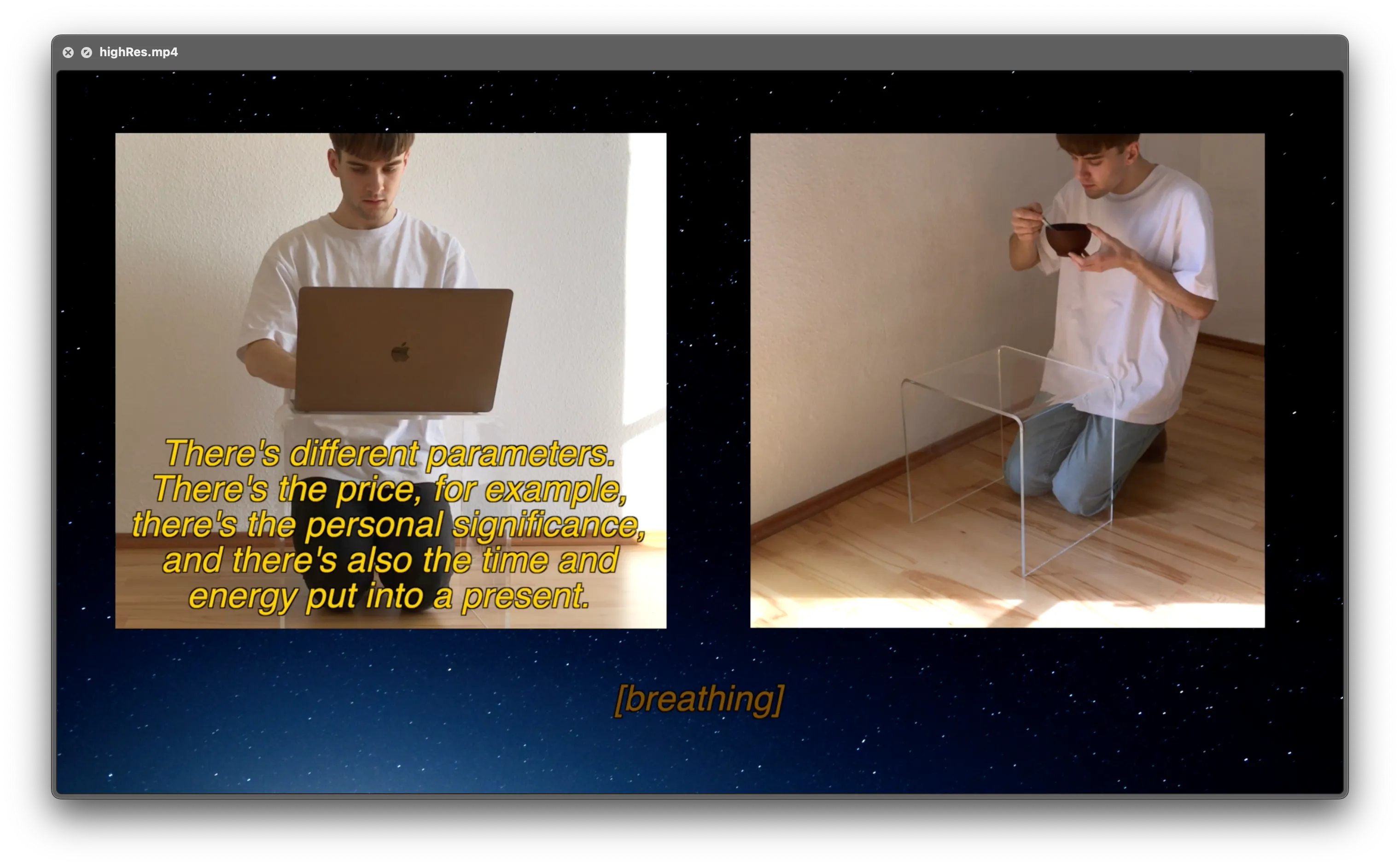 Screenshot eines Videocollage-Geschenks Das digitale Geschenk war speziell für einen Moment hergestellt und folgt daher ganz eigenen formalen Regeln. Bei physischen Geschenken gibt es häufig noch ein Drumherum, zum Beispiel eine sozial gecodete Übergabesituation oder ein Geschenkpapier, das oft verwendet wird. Diese Dinge können bei digitalen Geschenken total anders sein. Daher finde ich die Rahmenbedingungen schon sehr gut, gerade, wenn man bereits ein Geschenk erwartet - dann kann das Ganze zur einer Schnitzeljagd oder einem kleinen Geheimnis werden. Ich denke auch, das Besondere an digitalen Geschenken ist der zeitliche Aspekt, der dabei sonst nicht so präsent ist. Wenn man etwa Verbrauchsware oder etwas über die Zeit Unveränderliches bekommt, geht man mit dem Geschenk anders um. Digitale Geschenke erfordern Aufmerksamkeit und referenzieren nicht selten bestimmte Ereignisse oder Dinge aus der Beziehung zwischen beschenkter und schenkender Person.