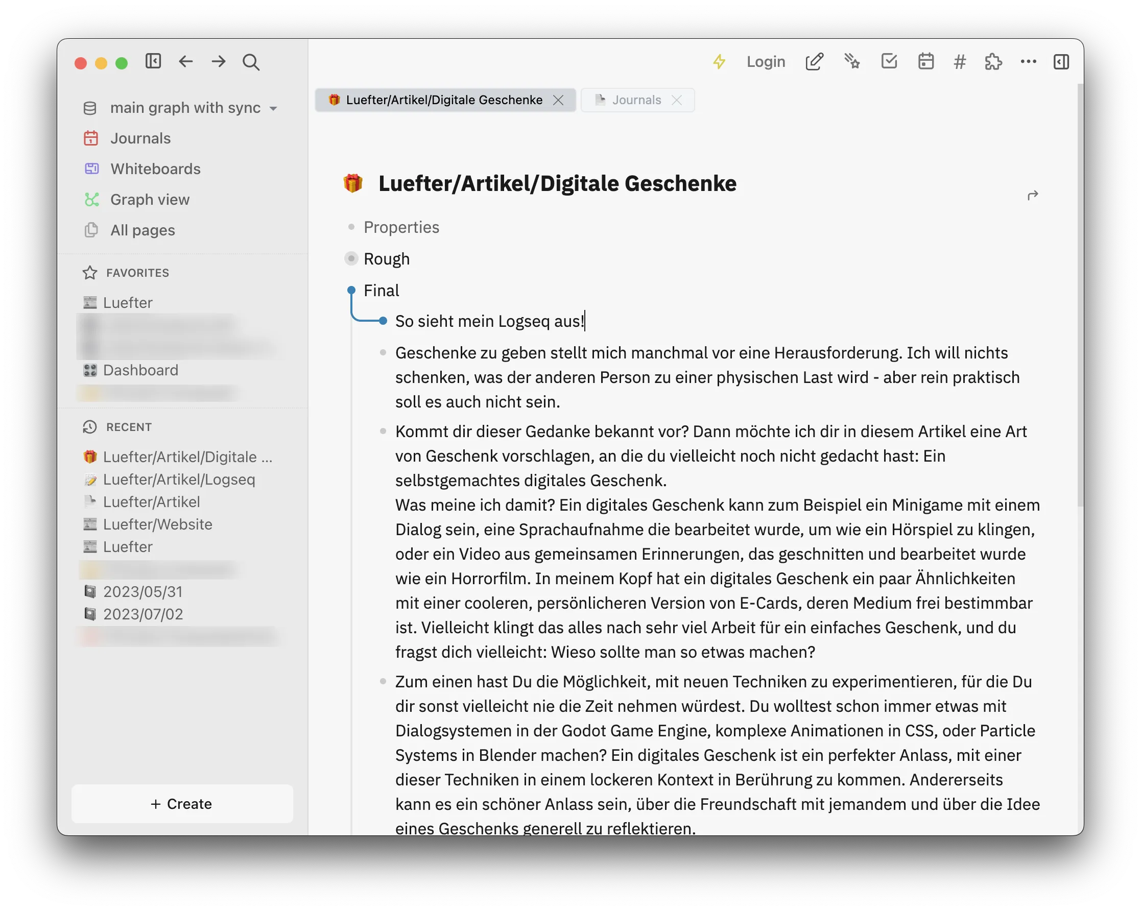 Und nun das Beste an Logseq: Alles, was du mit dem Programm schreibst, wird als lokale Markdown-Datei gespeichert. Das heißt es gibt keinen Cloud-Zwang, und Du behältst volle Kontrolle über Deine Daten. Um Notizen zwischen Geräten zu synchronisieren, kannst Du Logseqs eigenen Sync-Dienst oder Syncthing (siehe Chris’ Toolempfehlung) benutzen, die beide Ende-zu-Ende-verschlüsselt sind.